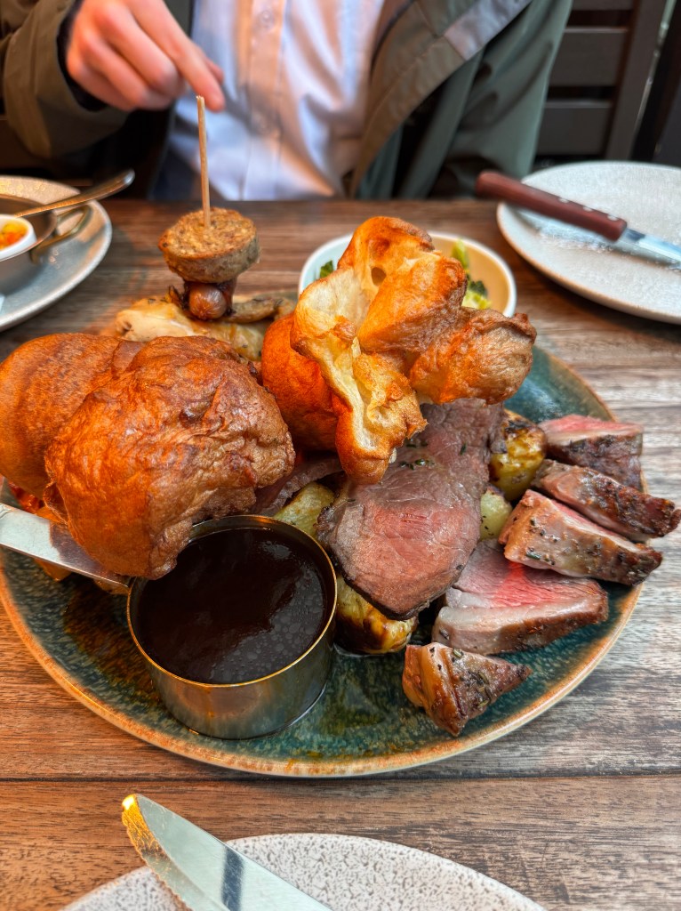 We opted for the Mega Sunday Roast for Two (not its name but I can’t remember its formal title) that had a little bit of each meat (beef, chicken, lamb) and what seem to be the typical Roast trappings of some rolls, roasted veggies, taters, and the gravy. Got some scotch eggs too because why not. Easily fed two. Beer was good too, but it most always is.